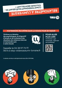 Pour signaler des VSS (violences sexuelles et sexistes), harcèlement et discriminations : 06 38 97 73 91 – stop-violences@univ-lorraine.fr (cellule d’écoute disponible 24h/24)